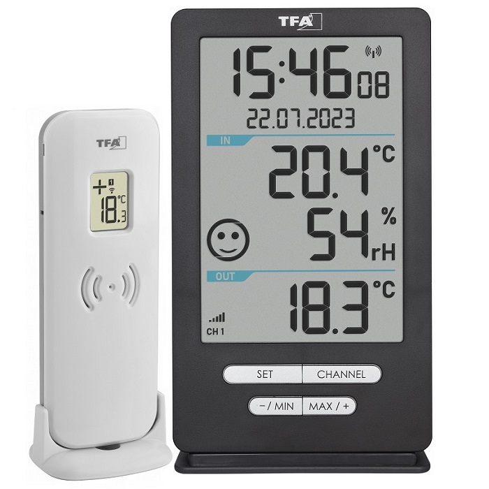 За допомогою цілеспрямованого опалення та вентиляції ви можете змусити його знову посміхнутися та створити приємне та здорове середовище проживання. Ви також можете заощадити витрати на опалення, контролюючи температуру. Зовнішній передавач має радіус дії до 100 метрів і майже не займає місця. Ви також можете придбати інші датчики температури у свого продавця, наприклад, щоб додатково перевірити температуру у підвалі чи гаражі. Виміряні максимальні та мінімальні значення можна викликати одним натисканням кнопки. Час і дата встановлюються автоматично за допомогою сигналу DCF77 і оновлюються щодня.
