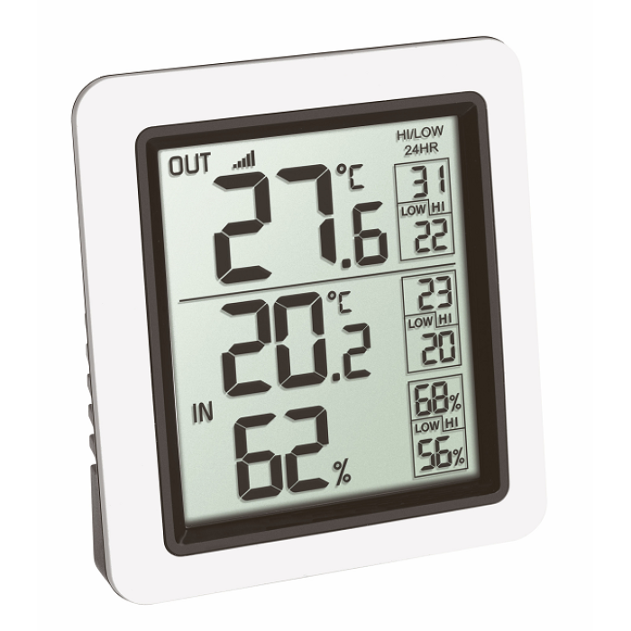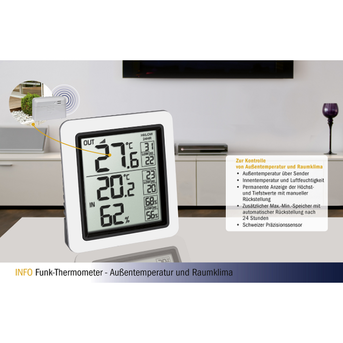 Одночасний моніторинг температури зовнішнього повітря і клімату в приміщенні - це стало можливим завдяки функціональному бездротовому термометру INFO від TFA Dostmann. Температура зовнішнього повітря на місці визначається бездротовим передавачем і відображається безпосередньо на дисплеї базової станції.