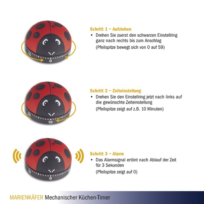 Особливості: Кухонний таймер у формі Сонечка Металевий заводний механізм, батарея не потрібна Плавно регулюється до 60 хвилин Звукова сигналізація після закінчення часу Пластиковий корпус