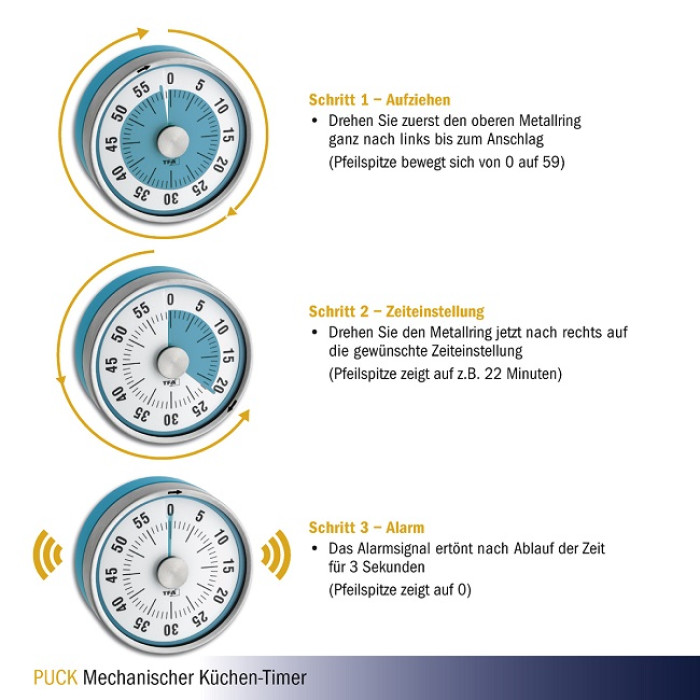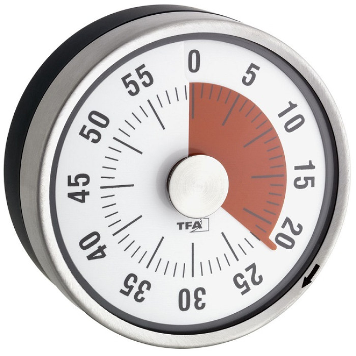 Особливості: Корпус з нержавіючої сталі і пластик з гумовим покриттям Металевий заводний механізм, батарея не потрібна Плавно регульований інтервал часу до 60 хвилин Звукова сигналізація після закінчення часу Кольорова індикація часу, що залишився З магнітом