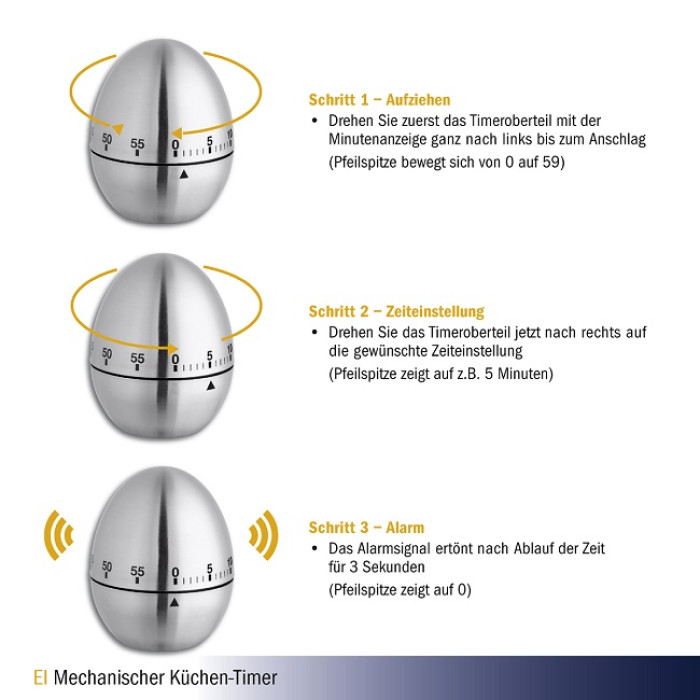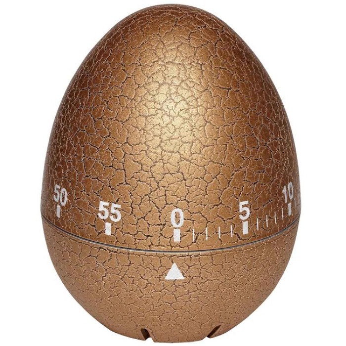 Особливості: Кухонний таймер у формі яйця з обробкою кракле Металевий заводний механізм, батарея не потрібна Плавно регулюється до 60 хвилин Звукова сигналізація після закінчення часу Незвичайний зовнішній вигляд
