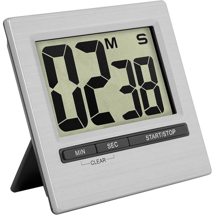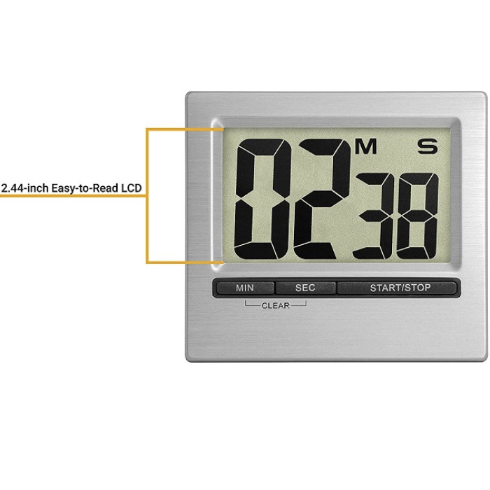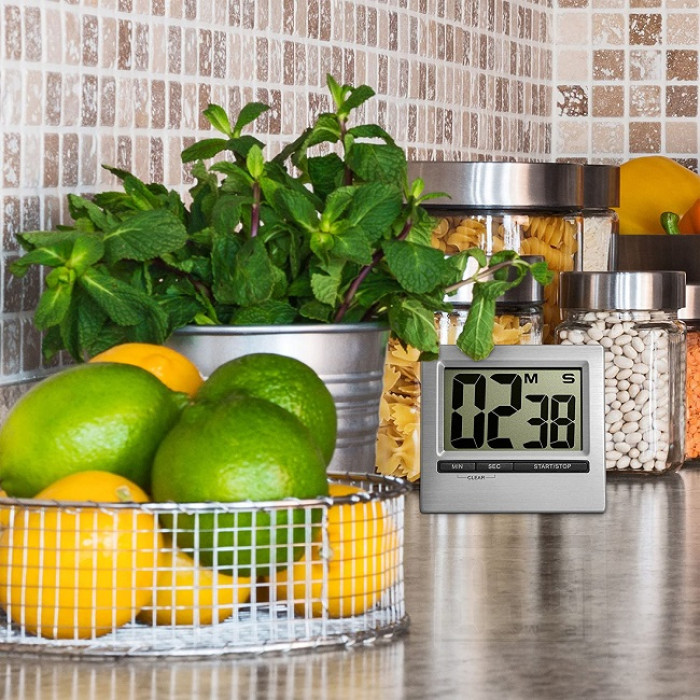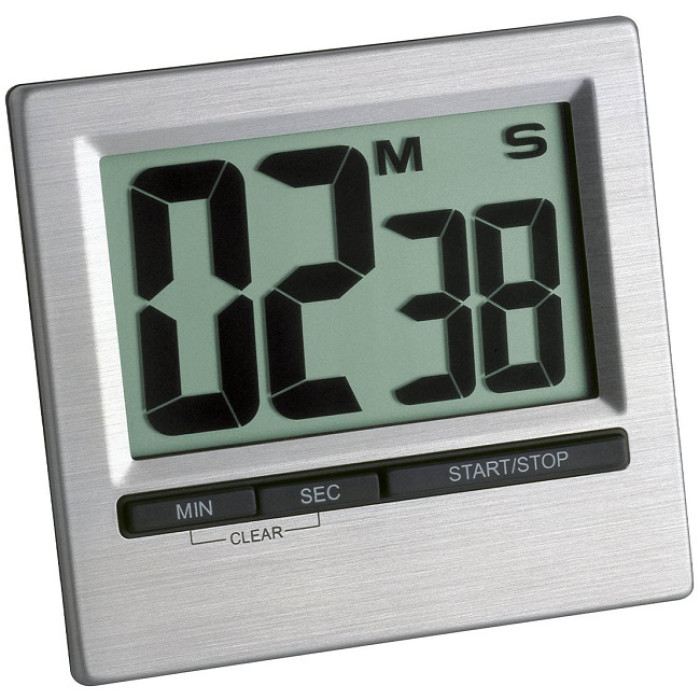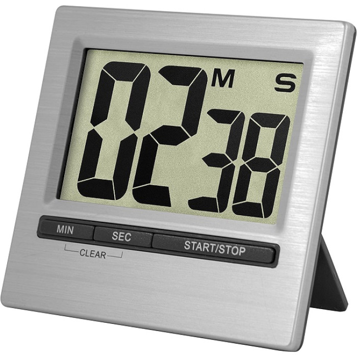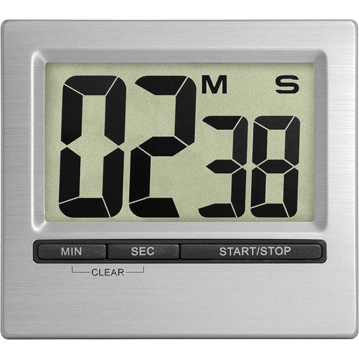 Особливості: Таймер і секундомір Зі звуковим сигналом Лицьова сторона з високоякісного алюмінію Великий дисплей З монтажним магнітом і підставкою Макс. налаштування часу: 99 хвилин, 59 секунд Батарейка у комплекті