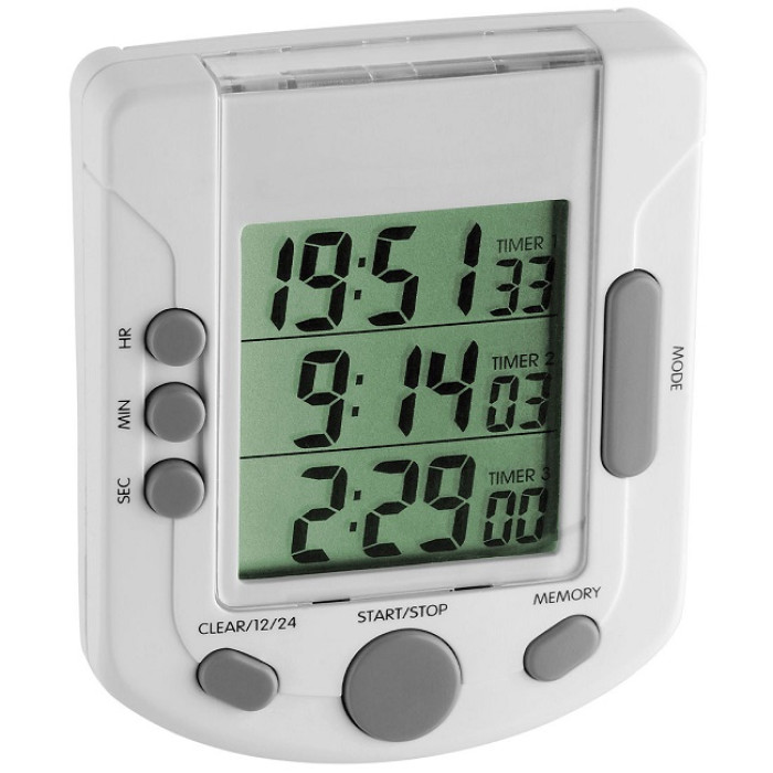 Особливості: 3 таймери з відліком у зворотному порядку з можливістю одночасної роботи Макс. налаштування часу: 19 годин, 59 хвилин, 59 секунд Таймер прямого відліку Індикація години / хвилини / секунди Зі звуковим сигналом Великі цифри, які легко читаються Секундомір Годинник З монтажним магнітом