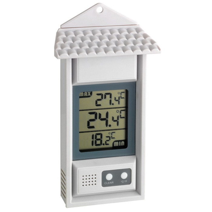 Цей цифровий термометр Максимум Мінімум є справжнім зовнішнім пристроєм. Завдяки атмосферостійкому корпусу можна легко повісити на вулиці. Найвищі денні температури та найнижчі нічні температури відображаються на чіткому дисплеї з цифровою точністю.Таким чином, практичний термометр ідеально підходить для саду та сільського господарства, а також для контролю температури в житлових приміщеннях, теплиці, винних льохах, складських приміщеннях чи морозильній камері.