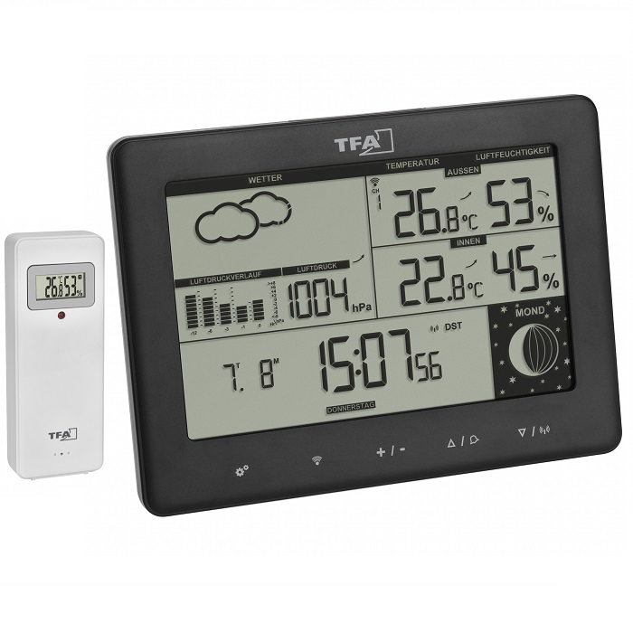 З бездротовою метеостанцією ELEMENTS ви захищені від погодних сюрпризів. Дізнавайтеся на чіткому дисплеї, чи буде в день, що наближається, сонце чи дощ, наскільки високі температура і вологість на вулиці, і скористайтеся численними додатковими функціями. Метеостанція оснащена радіопередавачем, який встановлюється в захищеному місці на відкритому повітрі і передає дані про зовнішні параметри на базову метеостанцію у вашому домі. Тут ви також можете легко переглянути тиск повітря, мікроклімат в приміщенні, а також всі максимальні і мінімальні значення. Час і дата з зазначенням повного дня тижня оновлюються по радіосигналу. Вбудований будильник з двома різними годинами будильника і функцією повтору розбудить вас вчасно. Поточна фаза місяця відображається у вигляді символу на стилізованому зоряному небі. Підсвічування дисплея активується при натисканні кнопки. Можна підключити два додаткових передавача для контролю температури і вологості, наприклад: для дитячої кімнати, підвалу або гаража.