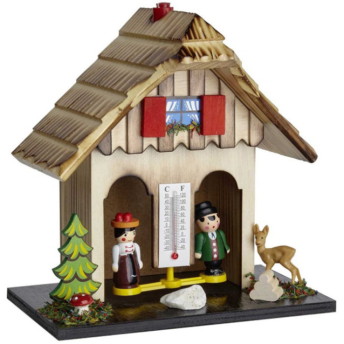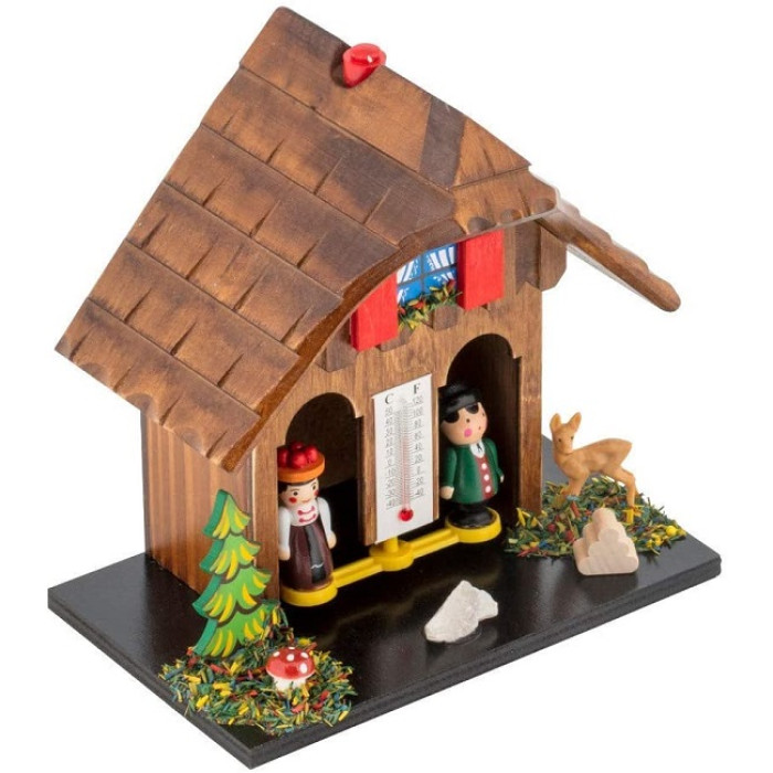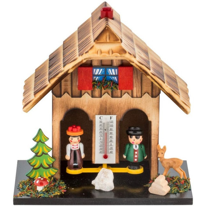 Особливості: Вироблено в Німеччині Ностальгічний погодний будиночок з дерева З "сонячної жінкою" і "дощовим чоловіком" Термометр в градусах Цельсія і Фаренгейта З термометром Гарантія 3 роки